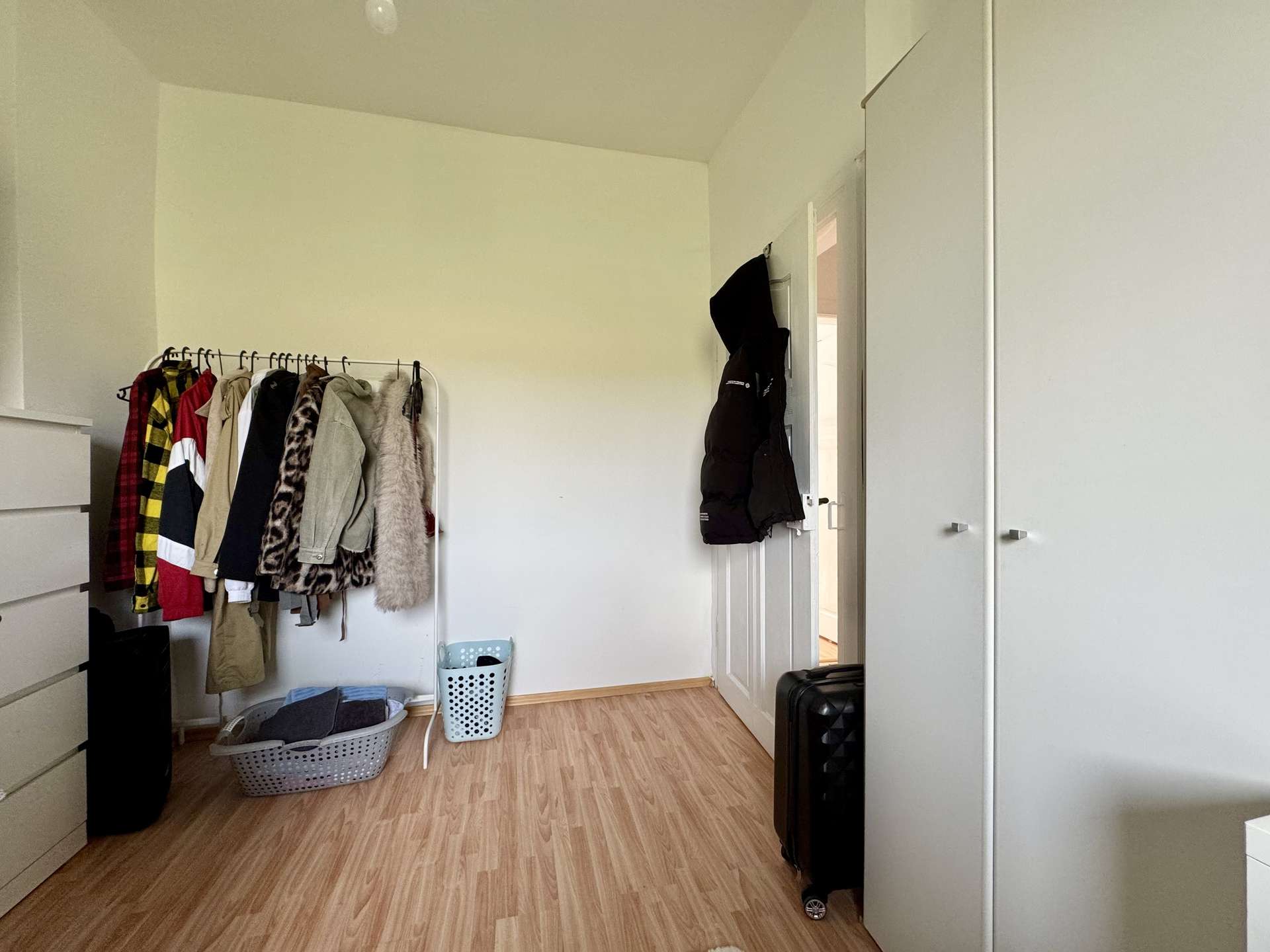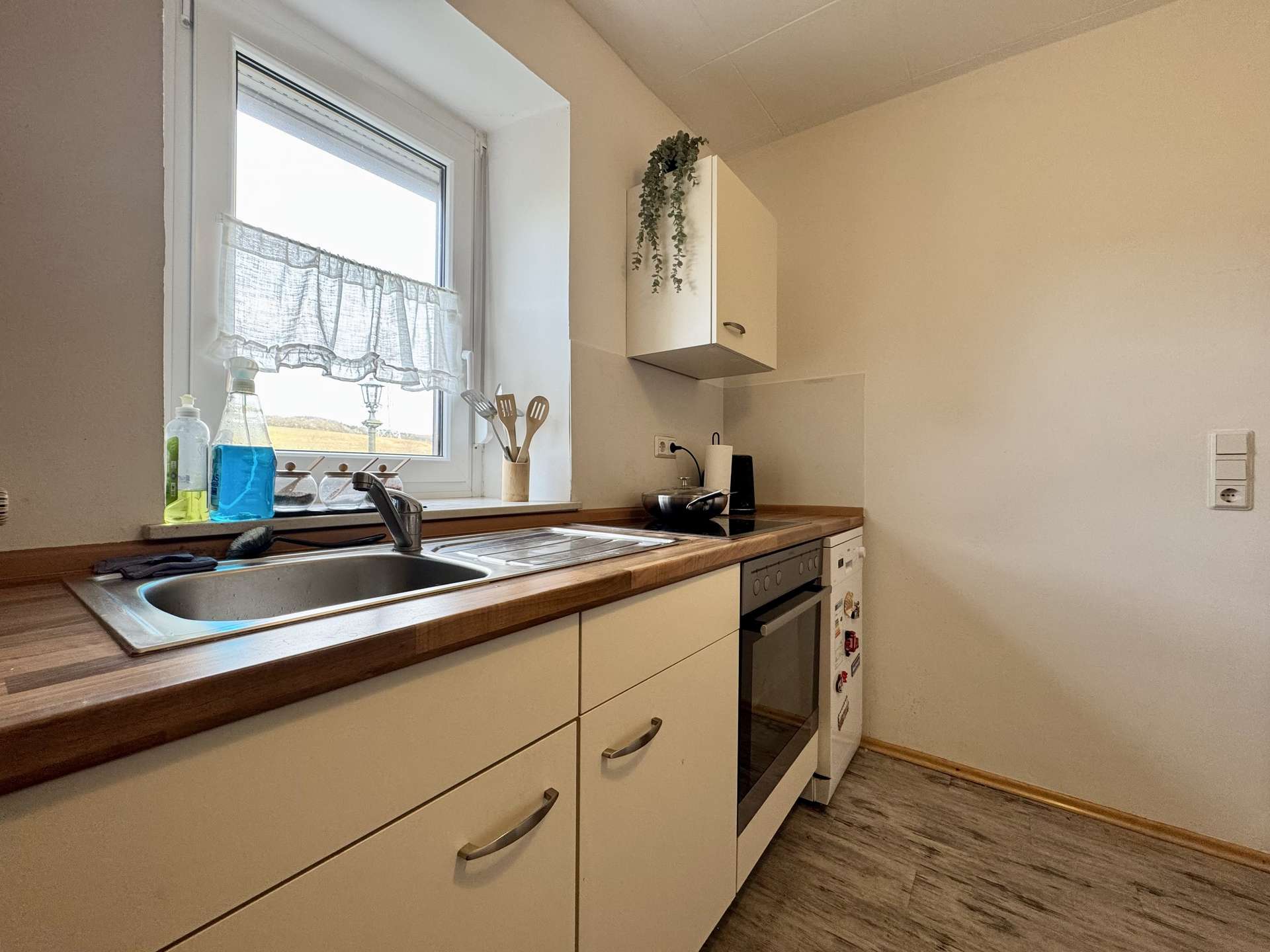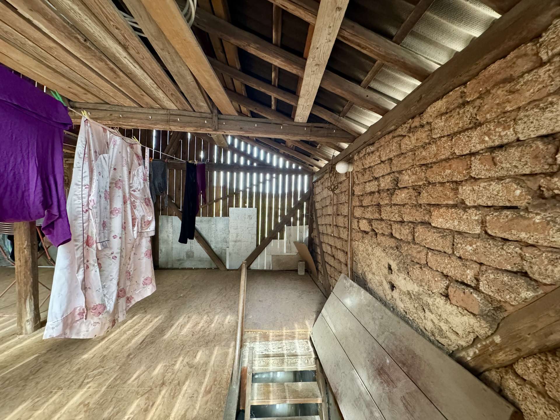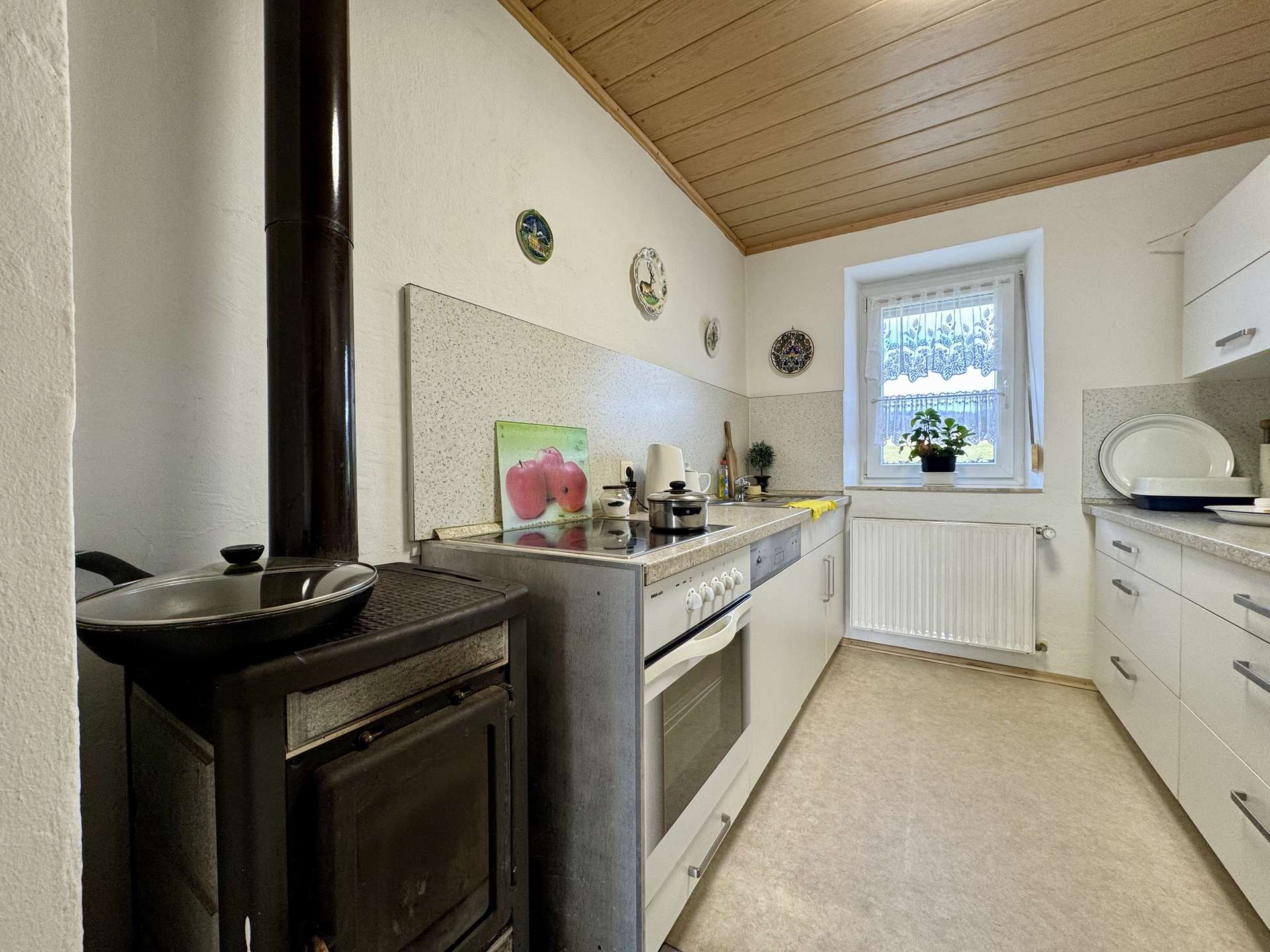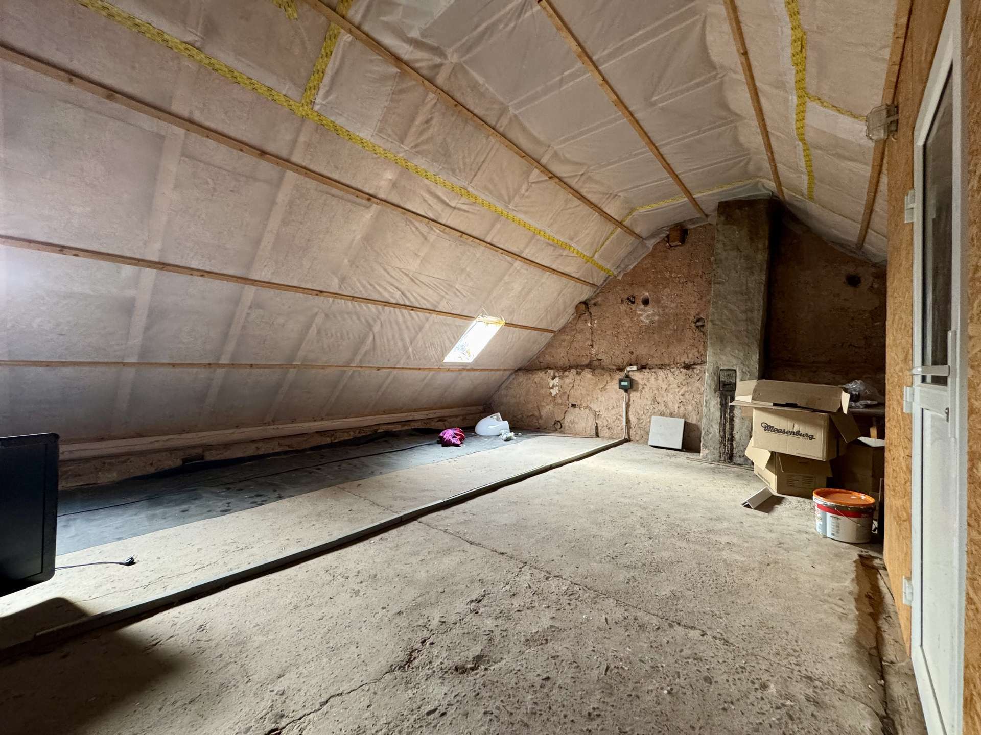 Das rechte Wohnhaus bietet eine Wohnfläche von ca. 70 m² und ist aktuell vermietet für 300 Euro KM. Vom Eingangsbereich führt ein Flur in das gemütliche Wohnzimmer und den großzügigen Küchenbereich. Zwei Stufen abwärts gelangt man in das Badezimmer sowie in einen praktischen Abstellraum mit Wasseranschluss für eine Waschmaschine. Eine steile Holztreppe führt zum Dachgeschoss der Scheune, das derzeit als Trockenraum für Wäsche genutzt wird. Im Obergeschoss befinden sich ein Schlafzimmer und ein mögliches Gästezimmer. Der Speicher bietet zusätzliches Ausbaupotenzial.